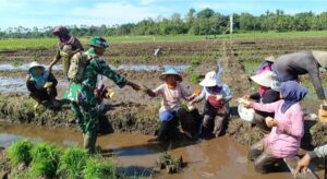 Dalam suasana penuh kebersamaan, TNI dan masyarakat melaksanakan penanaman padi secara bersama sebagai bentuk nyata sinergi dalam mendukung ketahanan pangan kegiatan ini juga dirangkai dengan monitoring pemanfaatan drone sprayer serta penyuluhan kepada petani mengenai penggunaan teknologi pertanian medern.